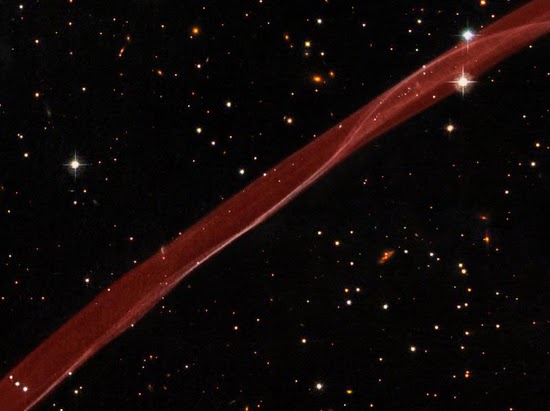 This image, taken by NASA's Hubble Space Telescope, is a very thin section of a supernova remnant caused by a stellar explosion that occurred more than 1,000 years ago.